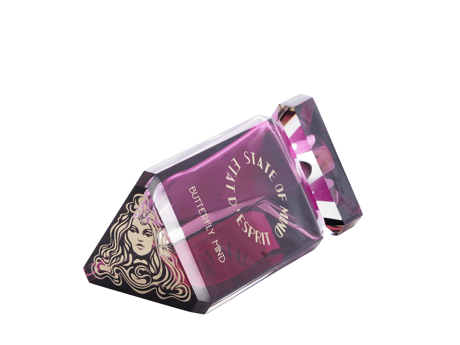 STATE OF MIND 100ml perfume bottle represents a unique jewel of great value. Hand-polished and crafted in the Art Deco style, the bottle is engraved with hot gold, and its crystal cap is magnetic.