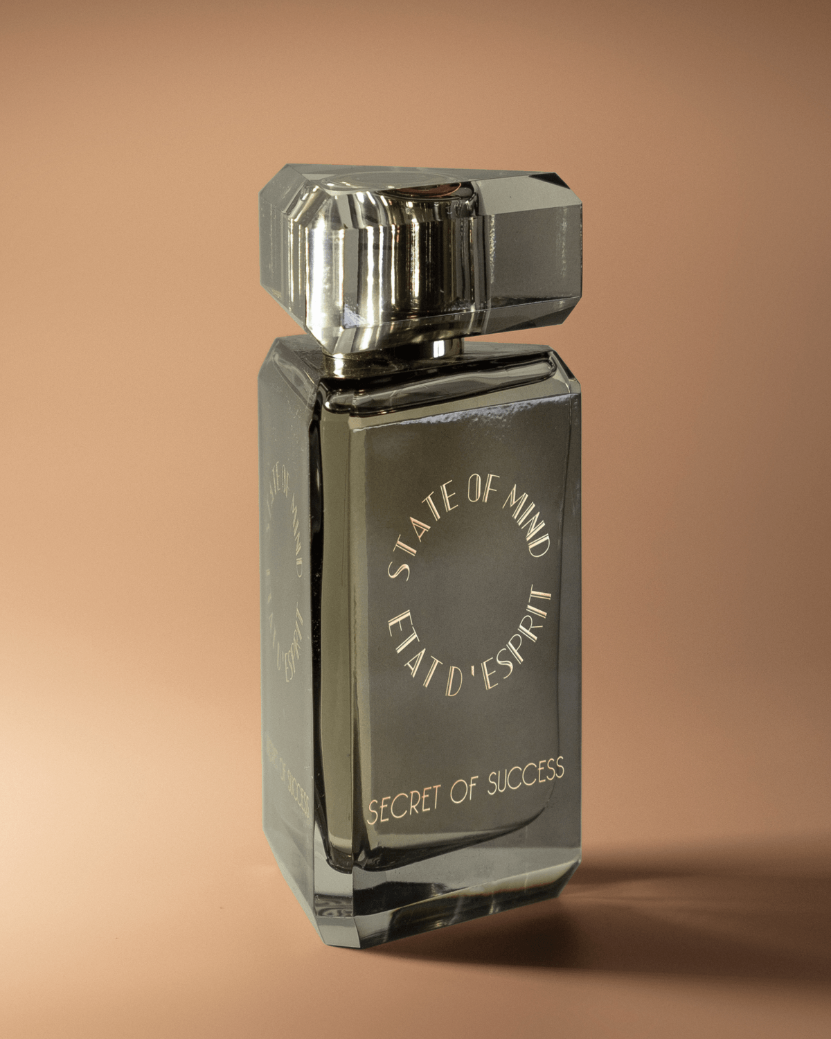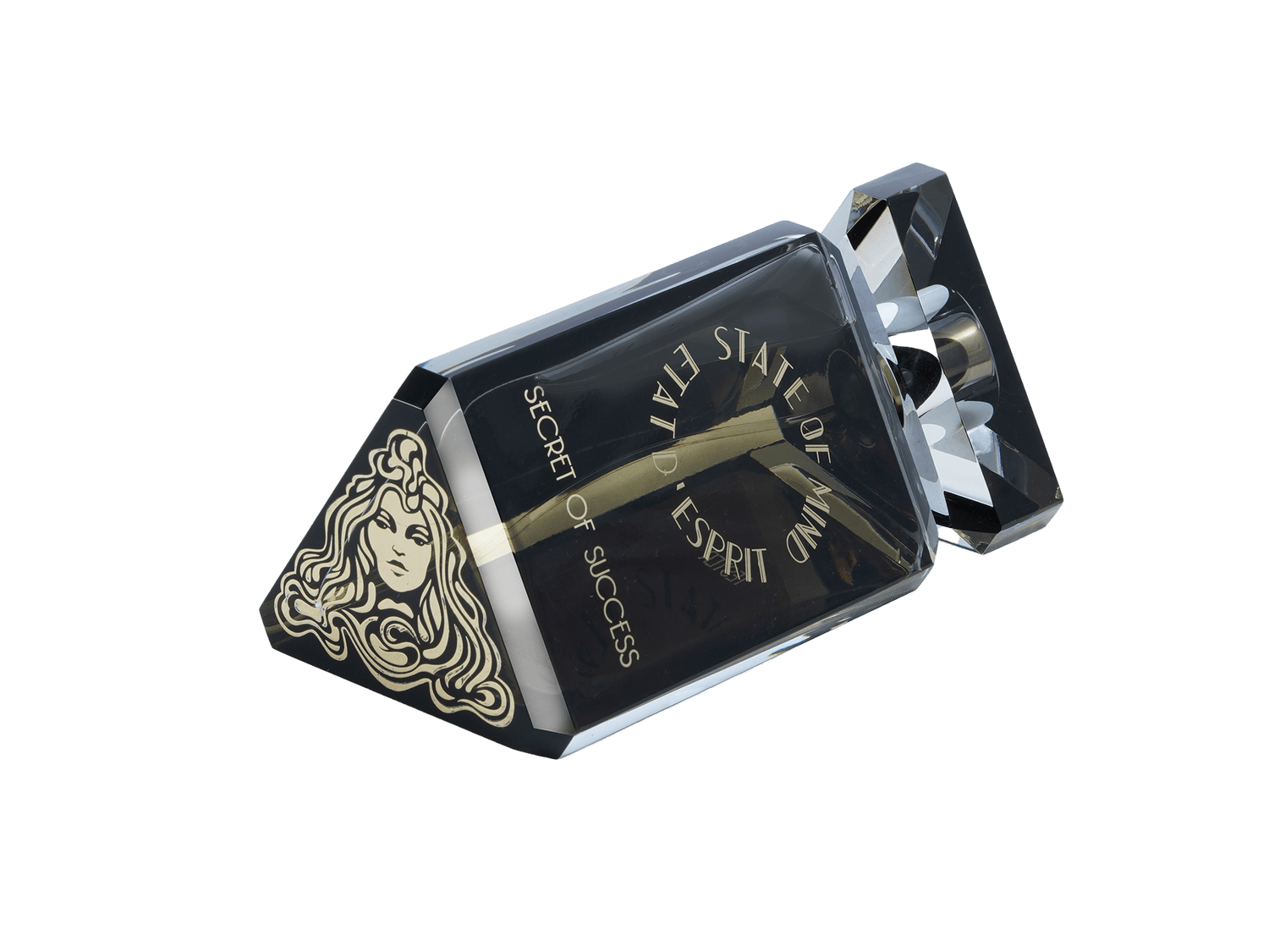 STATE OF MIND 100ml perfume bottle represents a unique jewel of great value. Hand-polished and crafted in the Art Deco style, the bottle is engraved with hot gold, and its crystal cap is magnetic.